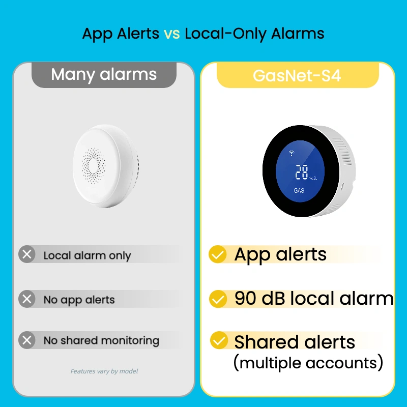 Yes. When connected to WiFi, GasNet-S4 sends real-time alerts to your phone through the mobile app. The local audible alarm will still function even if WiFi is temporarily unavailable.